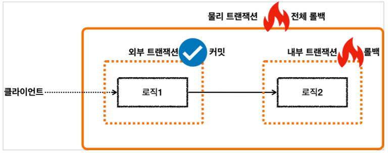 외부 트랜잭션이 롤백되면 물리 트랜잭션은 전체 롤백됩니다.