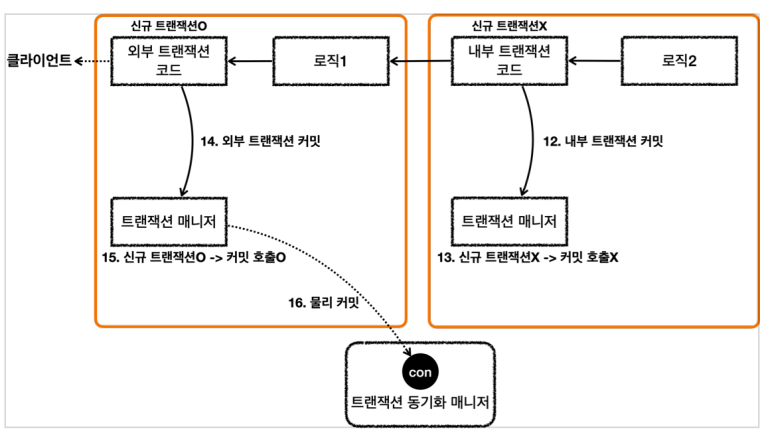 외부 트랜잭션과 내부 트랜잭션 총 2개가 커밋하는 코드와 그림으로 트랜잭션 전파 동작 순서를 알아보겠습니다.
