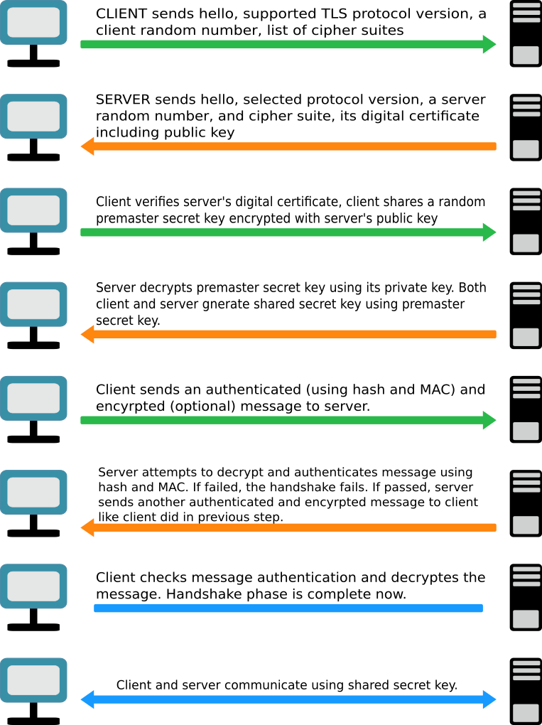 TLS는 SSL보다 늦게 등장했습니다. TLS는 비대칭 암호화를 이용한 데이터 인증을 제공합니다. 웹 사이트는 SSL 증명서라고 불리는 디지털 증명서를 보냅니다. 웹 브라우저는 증명서를 확인하고, 데이터 전송을 진행합니다.