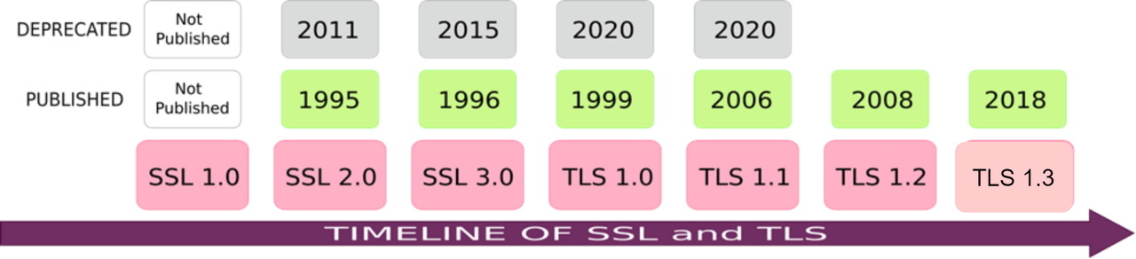 TLS 1.0 버전은 1999년에 IETF에서 개발되었습니다. 2006년 TLS 1.1으로 업데이트 되었고, 2008년 TLS 1.2 버전이, 2018년에 TLS 1.3버전이 출시되었습니다. TLS 1.0과 1.1은 이제 더이상 사용되지 않습니다. TLS 1.2와 1.3만이 2022년 기준 TLS에서 사용되고 있습니다.