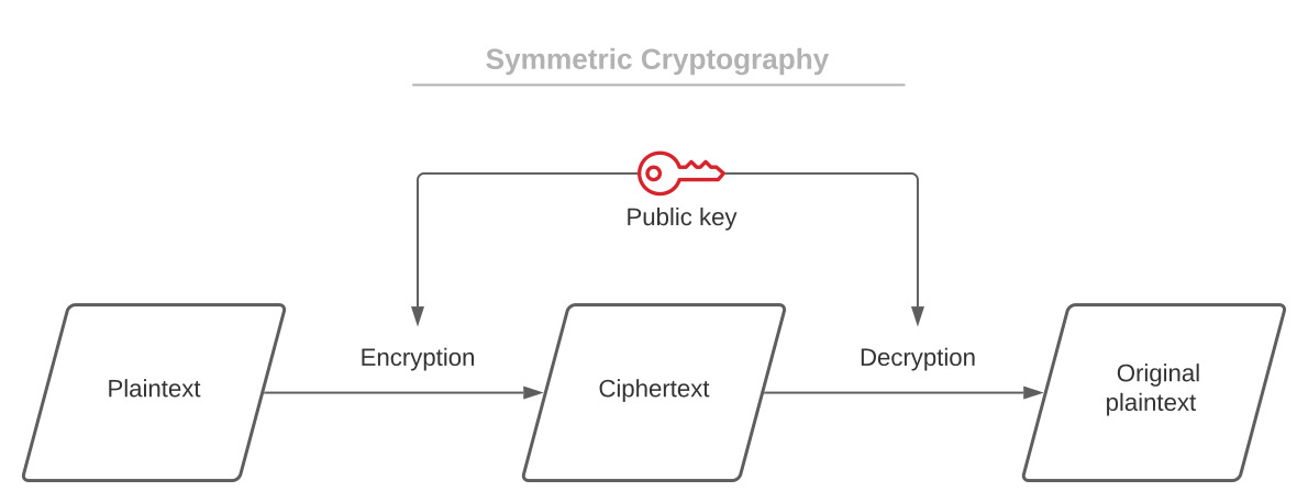 다른 말로, 전송자는 데이터를 암호화하기 위해 비밀키를 사용합니다. 그리고나서, 수신자는 데이터를 복호화하고 읽기 위해서 같은 키를 사용합니다. 그래서, 키는 데이터를 복호화하기 위해 관련된 사용자들에게 모두 공유되어야 합니다.