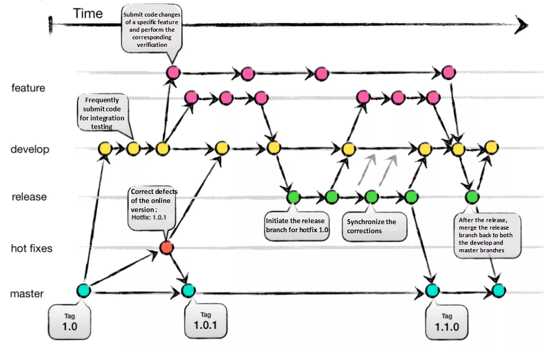 만약에 release 브랜치에서 문제가 발견되었다면, release 브랜치에서 문제를 해결한 후 develop 브랜치로 머지합니다. release 브랜치 코드가 정상 배포되었다면, 최종 코드는 develop과 master 브랜치로 머지합니다. 이 방법으로 matser 브랜치는 항상 운영 환경의 코드를 유지하고, dvelop 브랜치는 개발 환경의 최신 코드를 유지합니다
