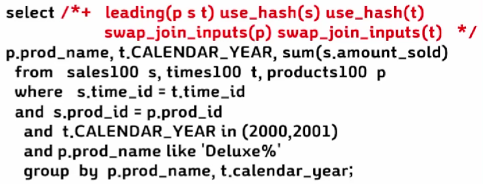 해당 힌트의 의미는 products100 -> slales100 -> times100 순서로 조인을 하는데, products100과 sales100을 해쉬조인하고, products 테이블을 해쉬 테이블로 합니다. 그리고 그 결과로 times100 테이블과 해쉬조인을 하는데, times 테이블을 해쉬테이블로 합니다.
