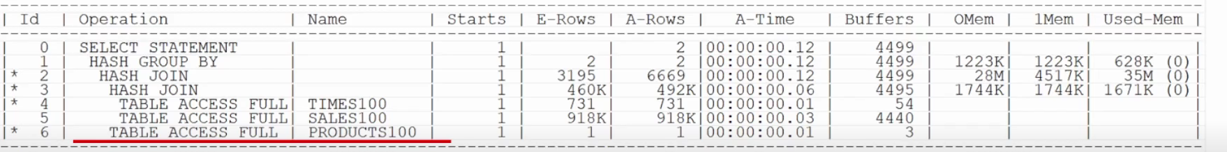 PRODUCTS 100 에서 1개의 행만 조회됨에도 불구하고, 해쉬테이블이 되지 못했습니다. 이 테이블을 해쉬 테이블로 강제로 설정해야 합니다.
