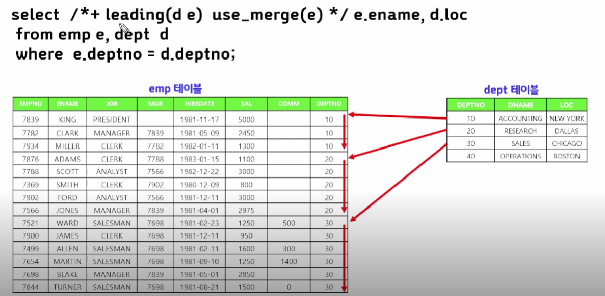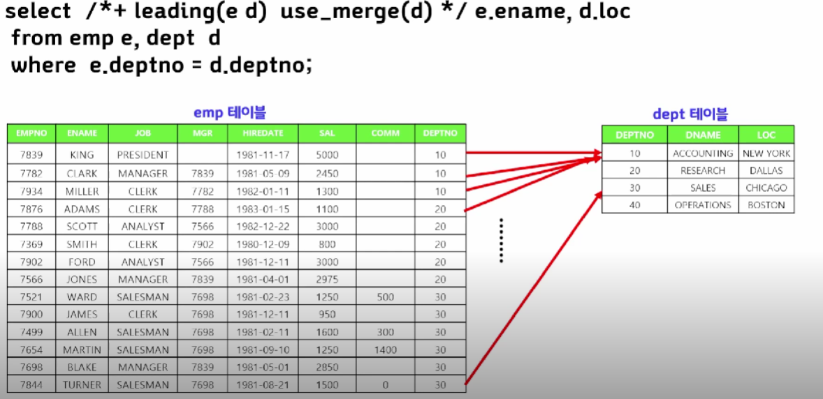 아래와 같이, emp 테이블은 DEPTNO를 정렬해서 조인합니다. 따라서 dept 테이블은 emp테이블에 모든 행을 매번 접근하는 것이 아니라, 정렬에 따라서 종료된느 시점까지만 접근하기 때문에 버퍼를 효율적으로 사용할 수 있습니다.