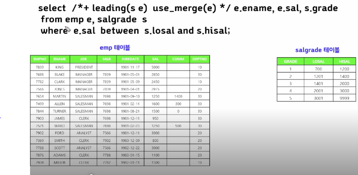 sort merge join은 내부적으로 정렬을 하고 조인을 하는 방식으로, not equal join에서 성능 향상을 위해 사용할 수 있는 방법입니다.