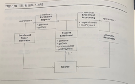 예를 들어, 그림 6.9에 나온 강좌 등록 시스템을 보겠습니다. 이 다이어그램에는 StudentEnrollment(학생 등록)을 사용하는 두 클라이언트가 있습니다. EnrollmentReportGenerator(등록 상황 보고서 생성자)가 preparedInvoice나 postPayment 같은 메서드는 사용할 일이 없다고 가정해보겠습니다. 마찬가지로 AccountsReceivable(받을 수 있는 계좌)은 getName이나 getDate 같은 메서드를 호출하지 않는다고 가정해 보겠습니다.