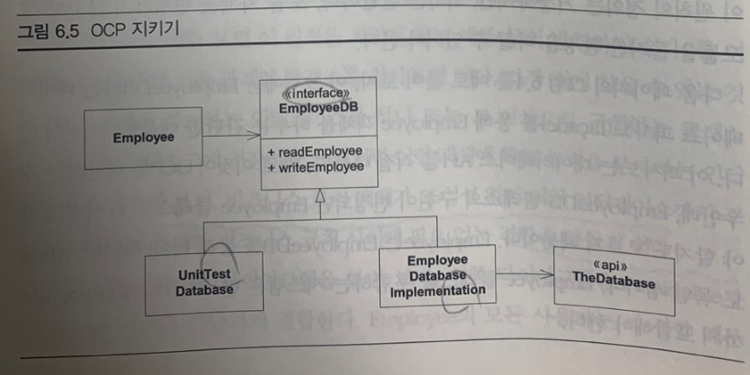 그림 6.4를 보면, EmployeeDB 데이터베이스 퍼사드(facade)를 통해 Employee를 다룹니다.(Employee는 EmployeeDB에 의존합니다) EmployeeDB 는 데이터베이스 API를 직접 다룹니다. 즉, EmployeeDB의 구현이 변경되면 Employee도 다시 빌드해야 할 수도 있으므로 OCP를 위반합니다. Employee는 EmployeeDB를 통해 데이터베이스 API와도 강하게 결합되어 묶인 셈입니다. 심지어, Employee 클래스를 포함하는 시스템은 반드시 TheDatabase API까지 포함합니다.
