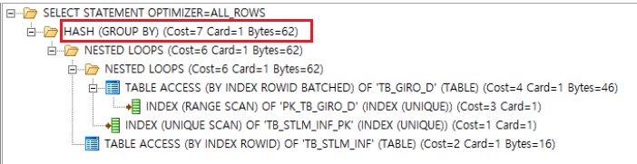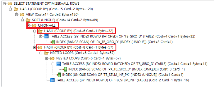 WHERE절에 제공일자 BETWEEN으로 NESTED LOOPS에서 (BY INDEX ROWID)를 사용하고, GROUP BY에 사용되는 3개의 칼럼은 PK이므로 INDEX가 (UNIQUE SCAN)으로 사용됩니다. 이는 기존에 2번 테이블으 접근하고 UNION-ALL을 한 것에 비해 훨씬 적은 비용과 공간을 활용하여 같은 결과를 출력합니다.