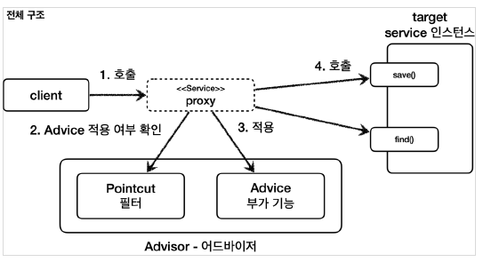 또한 프록시가 호출되었을 때 pointcut을 사용해서 advice를 적용할지 말지 검사합니다. 조건에 만족하면 프록시는 advice를 적용하고 나서 target을 호출합니다.(프록시는 advisor를 검사하여 advice, pointcut을 알 뿐만 아니라 실제 호출해야 하는 target도 알고 있습니다.)