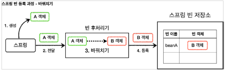 빈 후기처리는 기존에 스프링이 빈 저장소에 등록할 목적으로 생성한 객체를 저장소에 등록하기 이전에 조작할 수 있는 방법입니다. BeanPostProcessor를 사용하며 말 그대로 빈을 생성한 이후에 후처리를 할 수 있습니다.