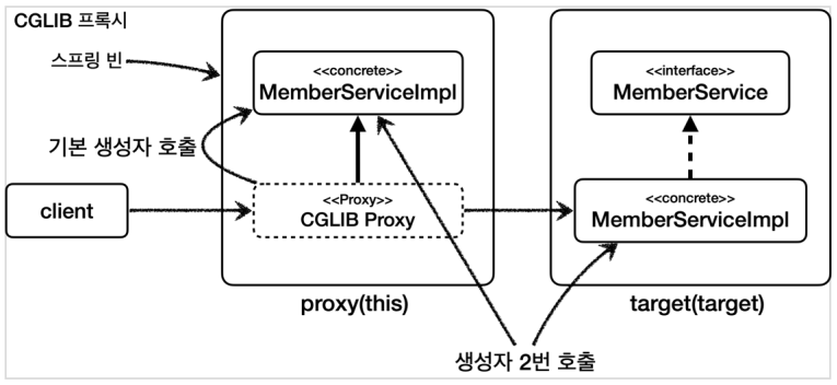생성자는 실제 target 객체를 생성할 때와 CGLIB 프록시 객체를 생성하면서 부모 클래스의 생성자를 호출할 때 총 2번을 호출합니다.
