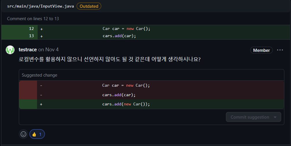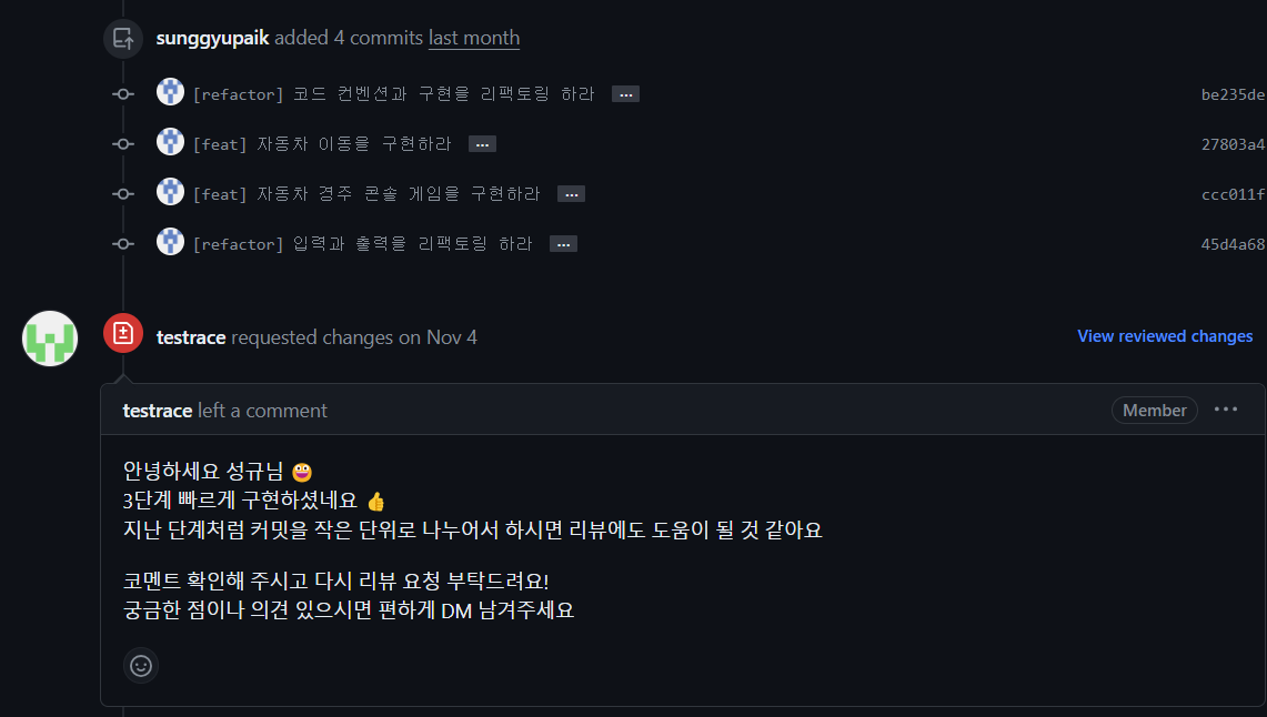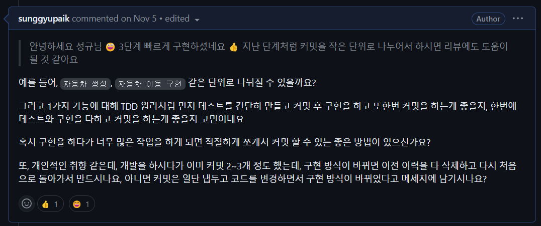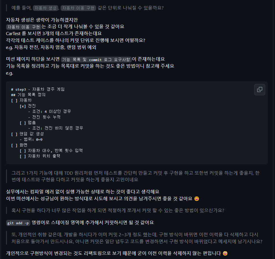 실질적으로 객체지향 과제를 시작하면서 무작정 구현을 시작하다보니 커밋 단위를 잘 나누지 못했습니다. 갈피를 잡지 못해 여러 번 수정하고 고민하면서 큰 설계도를 그리지 못한 점이 큽니다. 미리 기능 목록 리스트를 만들고 구현을 한다면 훨씬 적절한 커밋 메세지 작성을 할 수 있습니다.