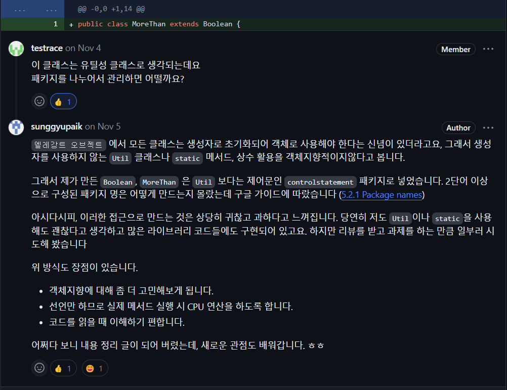 엘레강트 오브젝트에서는 객체지향은 당연히 하나의 클래스가 생성자를 가져 객체로 사용될 때 의미가 있다고 봅니다. 따라서 별도의 유틸 클래스라는 명칭을 싫어하고 심지어 유틸 성격의 클래스를 만든다면 객체를 활용하기를 권장 할 것입니다. 하지만 이번 과제에서는 과하지 않은 선에서 다양한 시도를 해봤습니다.