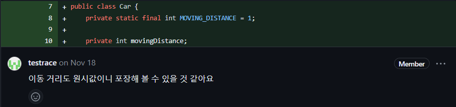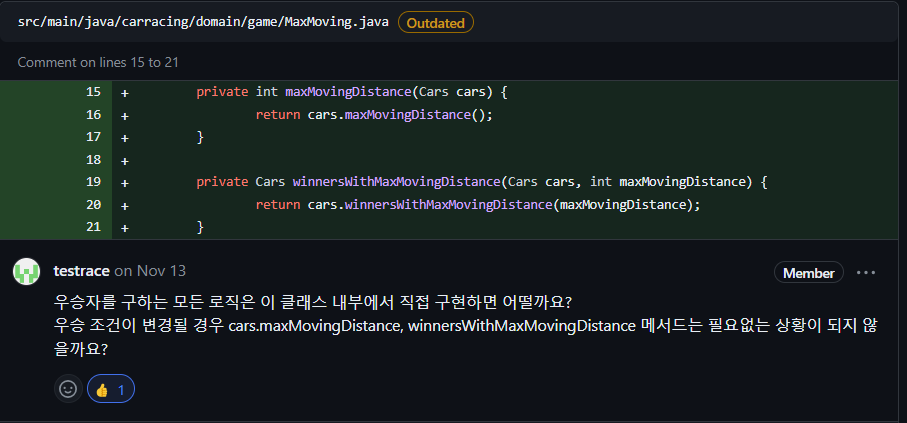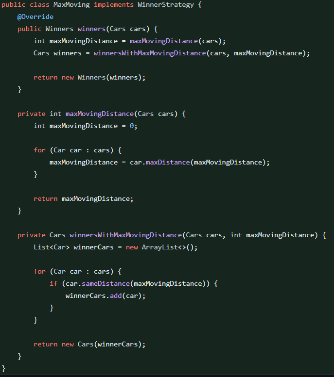MaxMoving은 이동거리를 구하는 하나의 방법일 뿐입니다. 만약에 MaxMoving의 방식이 바뀐다면, Cars 내부의 로직도 변경되어야 합니다. 따라서 MaxMoving과 Cars 로직을 모두 수정하지 않도록 관련된 로직은 모두 MaxMoving에서 구현해보도록 합니다. 정책 변경에 따라 변할 수 있는 부분인지, 절대적으로 상관없는 부분인지 고민하여 어떤 객체에 역할과 책임을 부여할지 고민합니다.