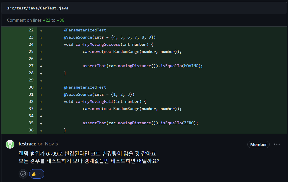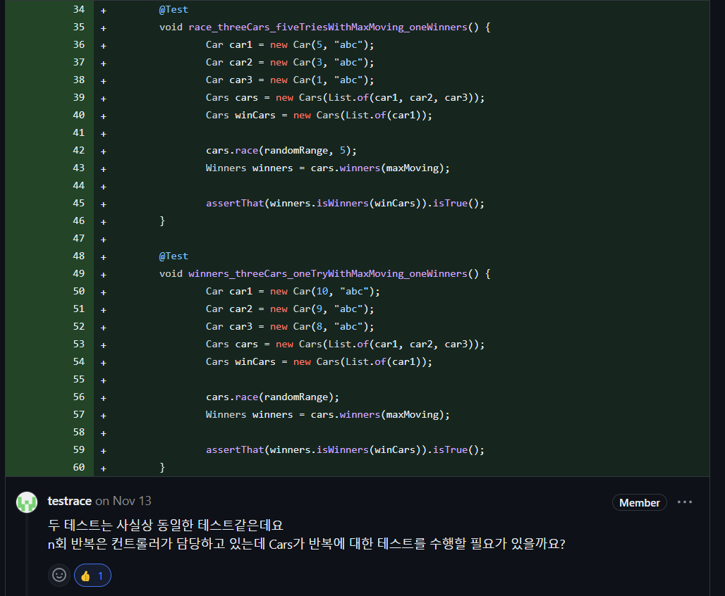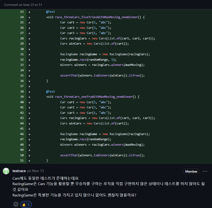 RacingGame 은 직접적인 우승자를 구하는 로직이 없고 Cars의 역할을 한번 감싸는 역할을 합니다. 따라서 중복되는 테스트가 됩니다. 별도의 추가 로직이 있는 것이 아니라면 작은 단위인 Cars에서 테스트 하는 것으로 대체가 가능합니다.