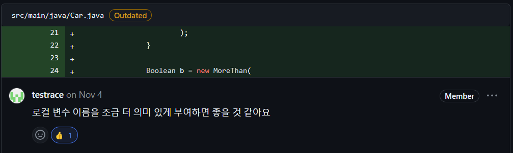 Boolean의 b의 이름이 모호하다고 느낄 수 있습니다. 선언형은 변수명 자체가 가지는 의미보다 선언형으로 선언된 과정이 중요하다고 생각해서 최대한 간결하게 표현하고자 했습니다. 그럼에도 조금 더 의도를 드러내면 사용자 입장에서 편합니다.