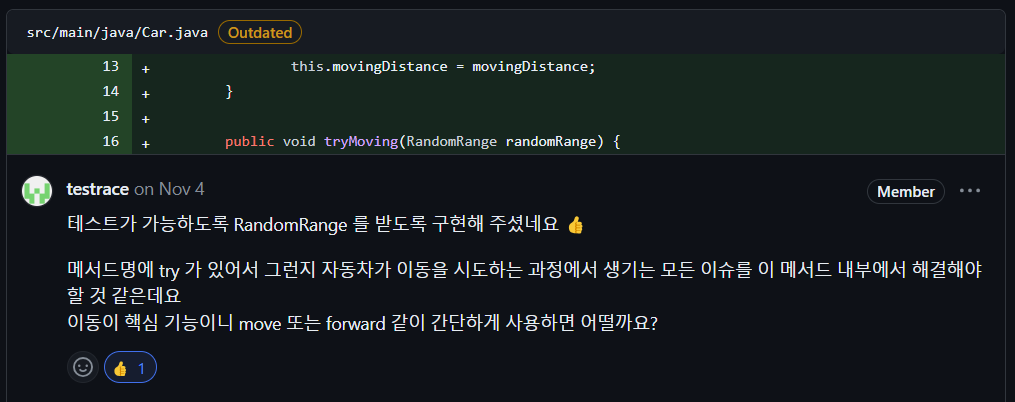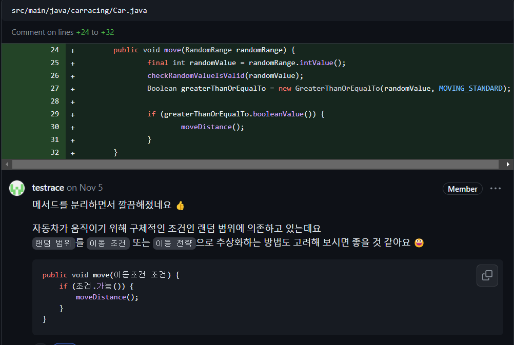 추후 해당 부분에 인터페이스를 사용하도록 가이드를 해주었는데 자체적으로 인터페이스로 미리 구현했던 부분이어서 기뻤습니다. 단지, 조건에 따라 이동이 가능한 메서드이기에 try를 붙였는데 오히려 너무 포괄적인 개념으로 비춰질 수도 있다고 하여 try를 제거하도록 했습니다. 객관적으로 다시 돌아보는게 필요합니다. 다른 사람이 봤을 때도 명확히 이해를 할 수 있는지 돌아보게 됩니다.