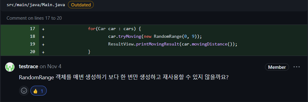for 문 안에서 계속 새로운 객체를 생성하고 있는데 단순 반복적으로 사용되는 코드라면 재사용이 가능합니다. 0~9까지 랜덤이라는 의도를 드러내기 위해서 작성했지만 따라서 for문 위에서 객체를 생성하고 반복사용하는 것이 낫습니다.