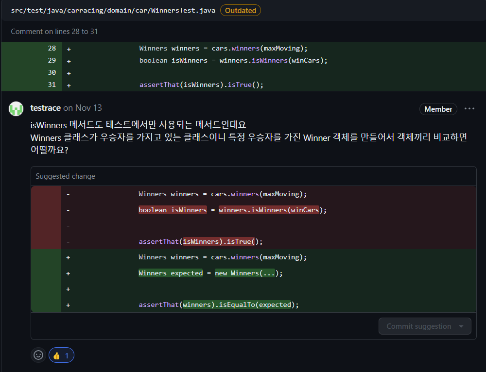 마찬가지로 우승자 비교도 테스트 전용으로 메서드를 만드는 것보다 차라리 EqualsAndHashcode를 구현하여 객체끼리 비교하게 하는 것이 훨씬 코드의 양을 줄일 수 있습니다.