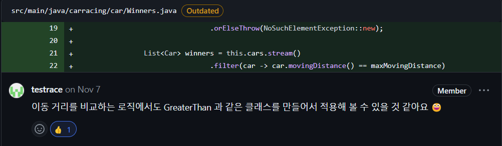 일급 컬렉션에서 우승자 객체는 최소한 1대 이상의 자동차를 가지는지 검사합니다. 아무런 우승자가 없어도 객체가 생성될 수 있다면 최종적으로 우승자를 구하는 로직에서 예상치 못한 오류가 날 수도 있습니다.