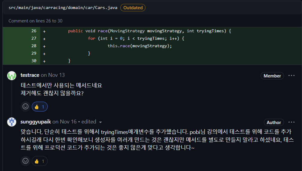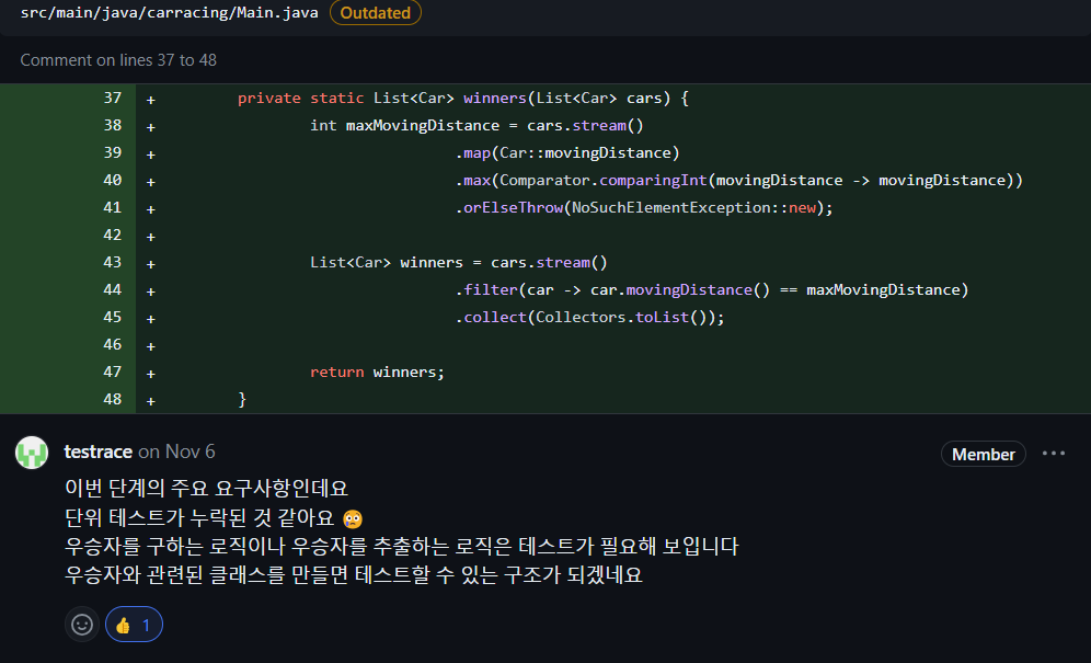 RacingGame 은 직접적인 우승자를 구하는 로직이 없고 Cars의 역할을 한번 감싸는 역할을 합니다. 따라서 중복되는 테스트가 됩니다. 별도의 추가 로직이 있는 것이 아니라면 작은 단위인 Cars에서 테스트 하는 것으로 대체가 가능합니다.