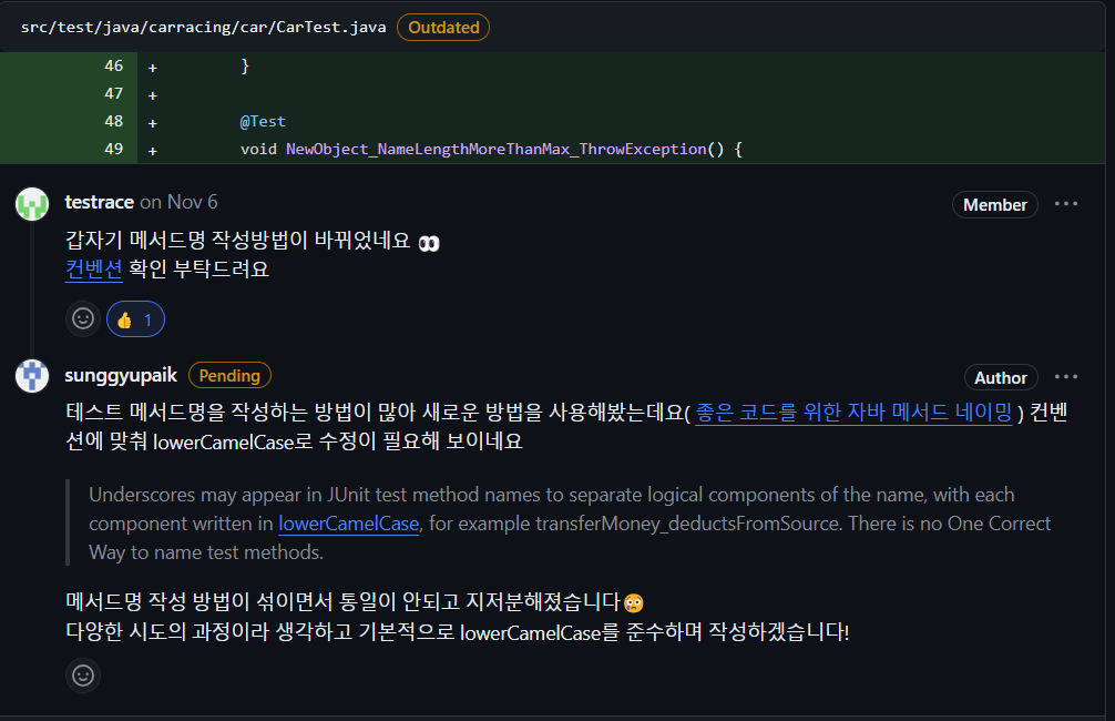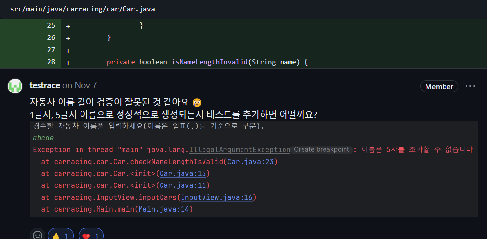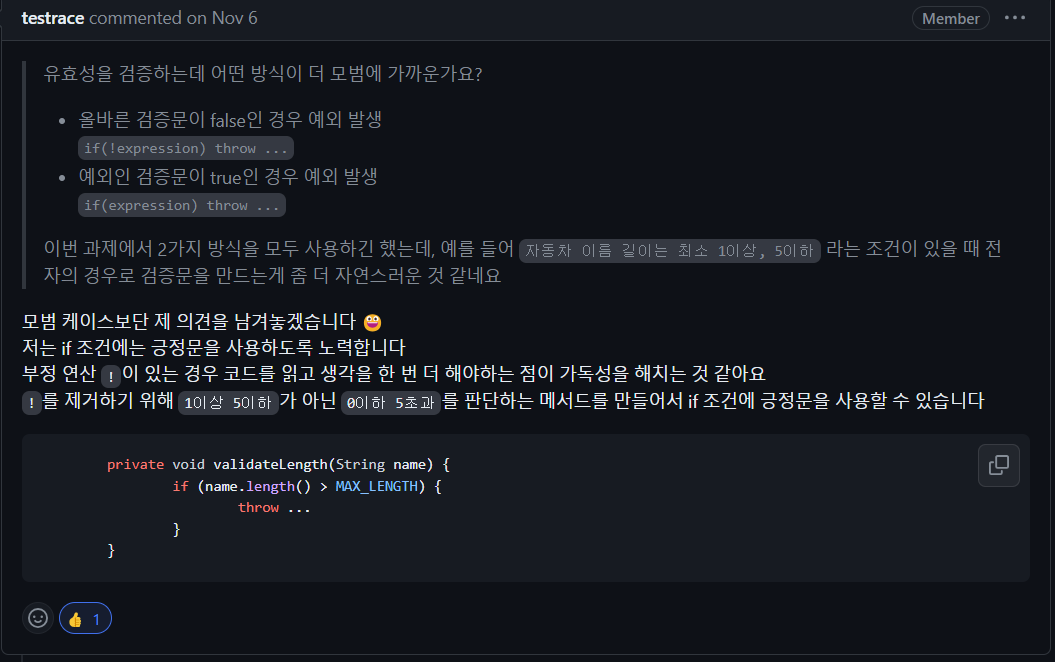 메서드명이 isNameLengthInvalid인 것도 다소 맘에 들지 않습니다. Valid를 써도 좋았을 것입니다. 조건을 반대로 적용하여 이름이 5자를 초과하지 않아도 예외를 던졌습니다. 메서드명에서 최대한 부정형을 쓰지 않고 Valid 같은 형식을 사용하고 실제 조건문에서도 긍정형을 사용하며 경계 값 테스트를 통해 확실하게 검증하는 방식으로 꼼꼼하게 작성 할 필요성을 느꼈습니다.