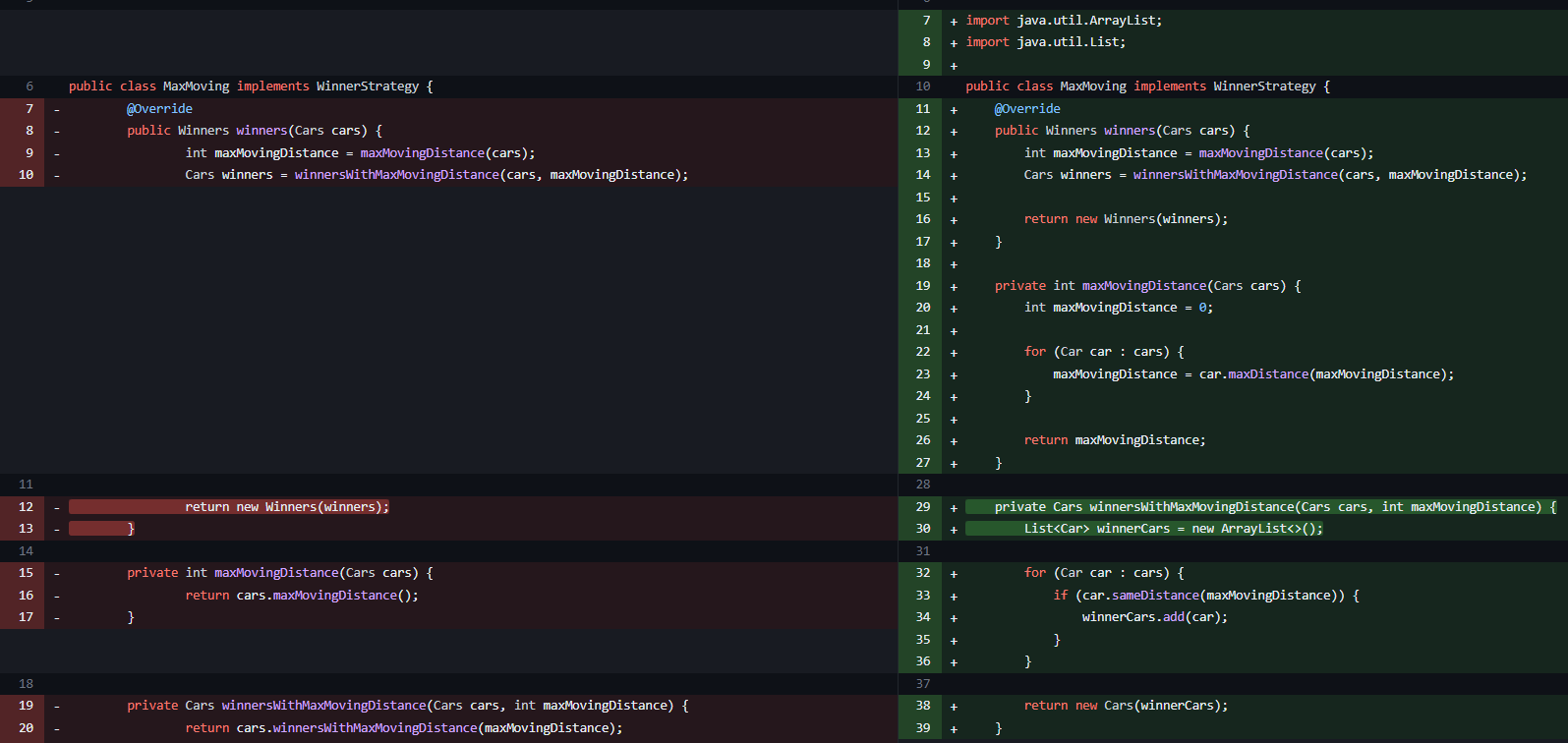MaxMoving은 이동거리를 구하는 하나의 방법일 뿐입니다. 만약에 MaxMoving의 방식이 바뀐다면, Cars 내부의 로직도 변경되어야 합니다. 따라서 MaxMoving과 Cars 로직을 모두 수정하지 않도록 관련된 로직은 모두 MaxMoving에서 구현해보도록 합니다. 정책 변경에 따라 변할 수 있는 부분인지, 절대적으로 상관없는 부분인지 고민하여 어떤 객체에 역할과 책임을 부여할지 고민합니다.