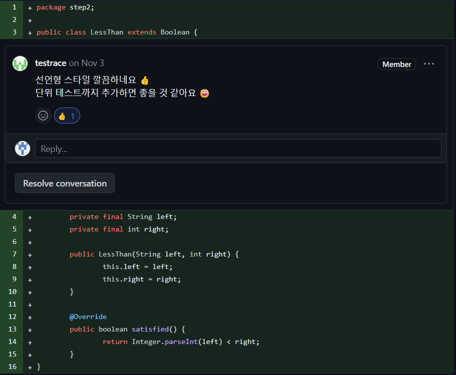 엘레강트 오브젝트 책에서 선언형 스타일로 코딩 할 것을 추천해서 사용해 봤습니다. boolean형을 Boolean으로 인터페이스 선언하고 LessThan이라는 같거나 작은 경우를 satisfied() 메서드를 통해 실행합니다. 피드백 과제전형의 좋은 점은 다양한 스타일을 시도하고 공유할 수 있다는 점입니다.