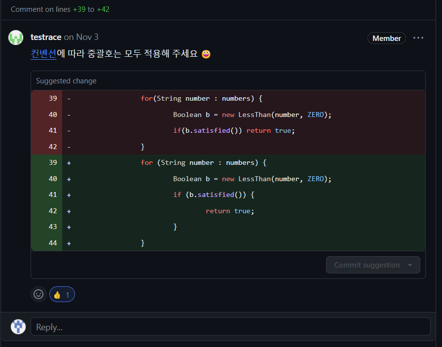 무의식적으로 컨벤션을 어기고 있는 부분이 있다면, if, for 등을 사용할 때 괄호를 사용하지 않고 붙여서 사용하는 것 입니다. 이왕 컨벤션을 따라 코딩한다고 한다면 이런 사소한 부분들도 지키면 좋습니다.
