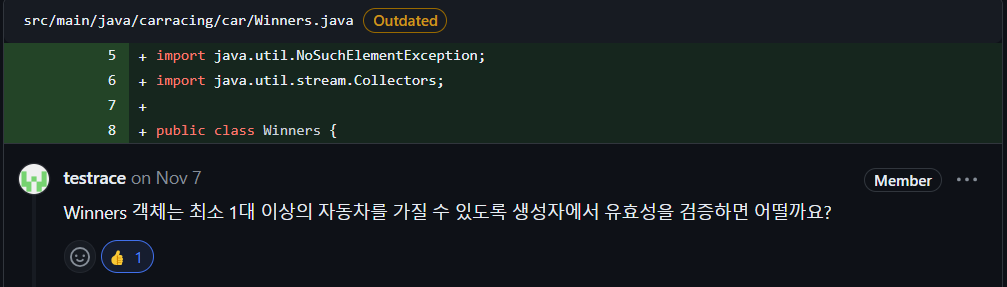 일급 컬렉션에서 우승자 객체는 최소한 1대 이상의 자동차를 가지는지 검사합니다. 아무런 우승자가 없어도 객체가 생성될 수 있다면 최종적으로 우승자를 구하는 로직에서 예상치 못한 오류가 날 수도 있습니다.