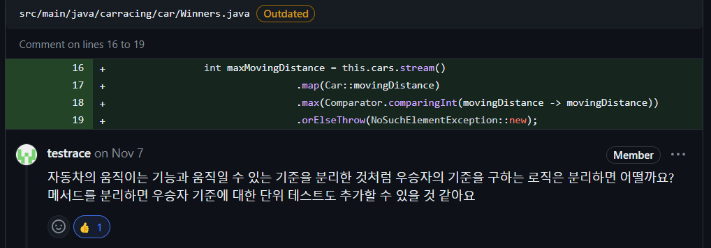 우승자를 구하는 기준은 하나의 의미를 가지는 비지니스 로직입니다. 추후 우승자를 구하는 기준이 변경 될 수도 있습니다. 따라서 해당 부분을 별도의 메서드로 분리합니다.