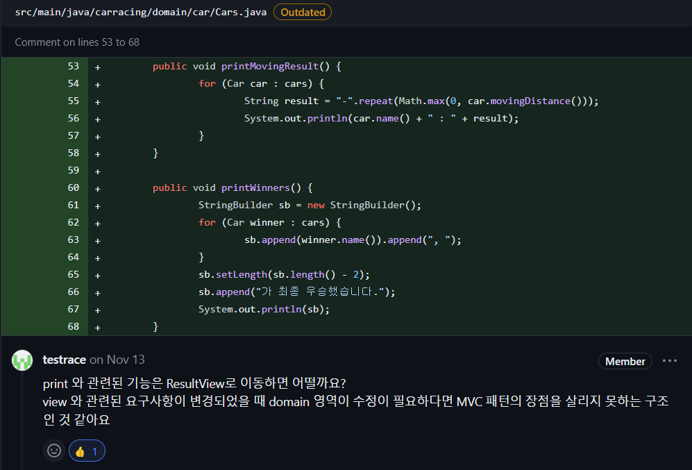 도메인에 print 관련 로직이 있다면, 출력의 조건이 바뀌면 ResultView 뿐만 아니라 도메인도 변경되야 합니다. 이는 MVC 패턴의 원칙을 지키지 못해 장점을 잃어버립니다. 따라서 직접적인 문자열 작성은 도메인에서 하지 않습니다.