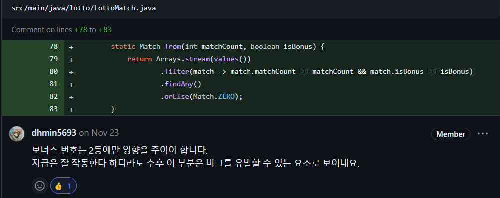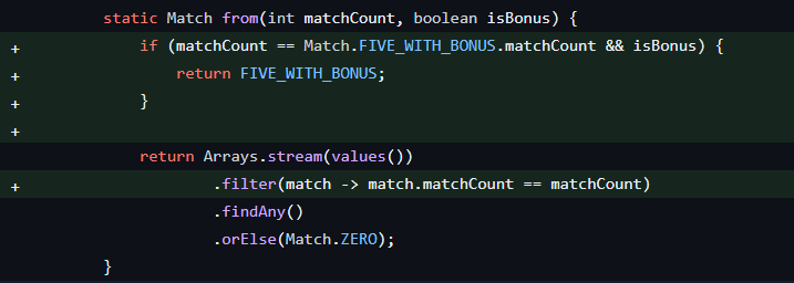 matchCount가 2인 경우에만 보너스에 영향을 줍니다. 매개변수로 넘어오는 isBonus에도 철저하게 로직 검사를 했기 때문에 버그를 유발 할 가능성이 적다고 생각했습니다. 하지만, 만에하나 잘못 수정이 된다면 오류가 발생할 가능성은 얼마든지 있습니다. 따라서 2등인 경우만 별도로 검사하고 이후에는 isBonus를 사용하지 않도록 수정합니다.