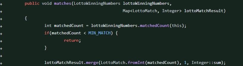 단순하게 결과를 int 값으로 받으면 저장과 사용에 한계가 있습니다. 명확하게 결과 값인지 구분 하기도 힘듭니다. 따라서 별도로 결과를 저장하는 LottoMatch를 통해 의도를 명확히 드러내고 유효성도 검사 할 수 있습니다.