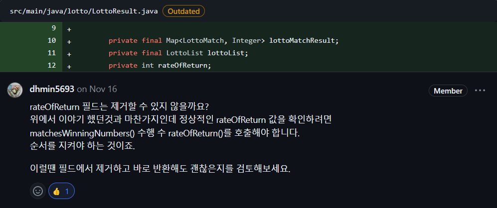 결과 값을 필드로 가져 조회 할 수 있게 할 것인가, 메서드가 리턴 값을 가져서 바로 반환 할 것인가 고민해 보았습니다. 혹시 해당 결과를 여러 번 반환해야 한다면 캐싱 개념으로 한번만 작업하고 게속 reateOfReturn을 조회하면 좋겠다고 생각했습니다.