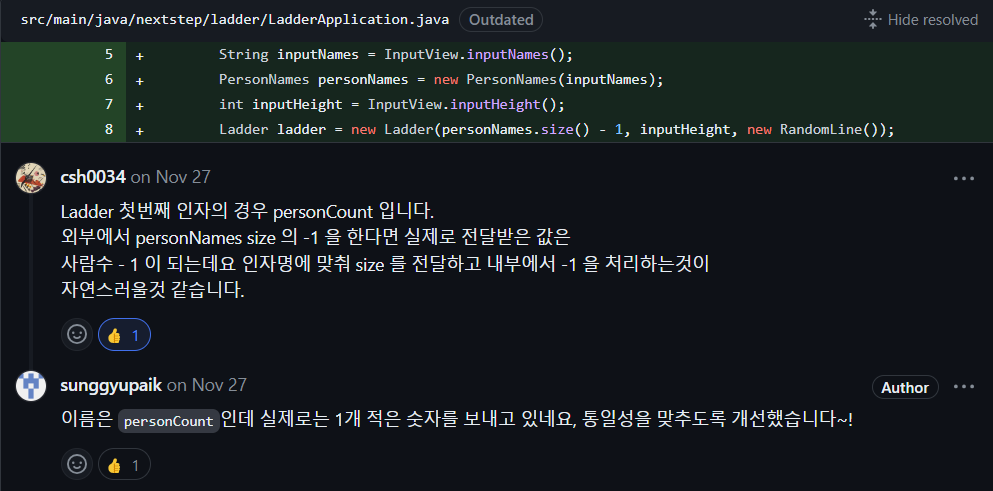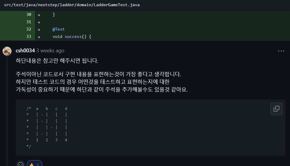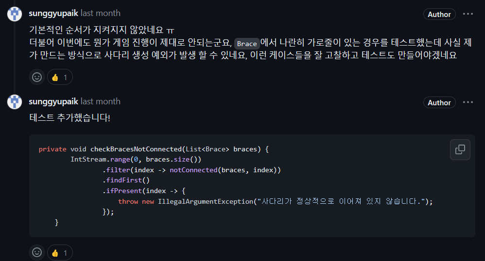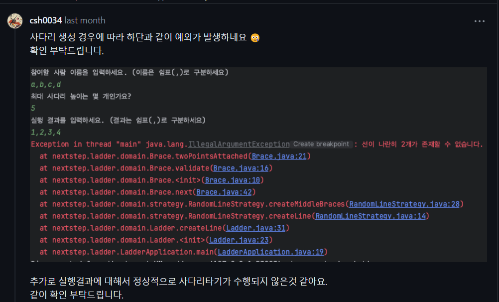 제대로 테스트를 만들지 못했기 때문에 정상적인 사다리 게임이 예외를 던졌습니다. 혹시 설계가 너무 복잡하여 테스트도 덩달아 어려워지지 않았는지 생각해봐야 합니다. 케이스가 많고 여러 개의 검증이 필요하다면 테스트를 좀 더 꼼꼼하고 세세하게 해도 괜찮습니다.