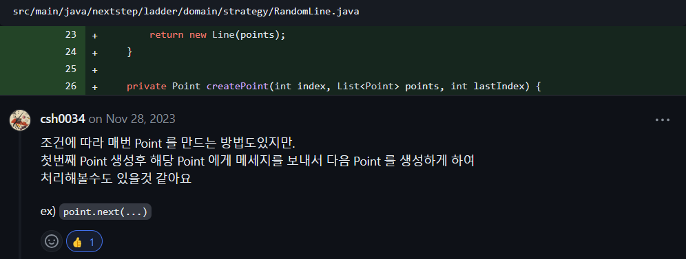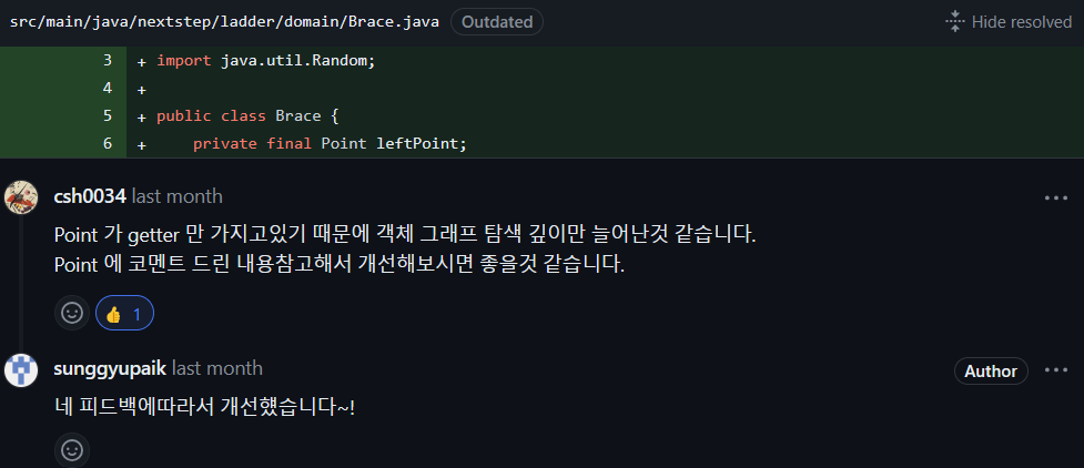 Point 클래스는 boolean current처럼 1개의 boolean형만 가지며 getter로서 활용 되었습니다. 기본 자료형을 감싸고 싶었습니다. 하지만 한번 더 감싸서 얻는 이득이 없었습니다. 오히려 탐색 깊이만 늘어났습니다. 따라서 사다리 index를 좀 더 편하게 이해하기 위해 Point 대신에 뼈대의 의미를 가지는 Brace 클래스를 만들었고 left, right 2개의 변수를 가지도록 개선했습니다.