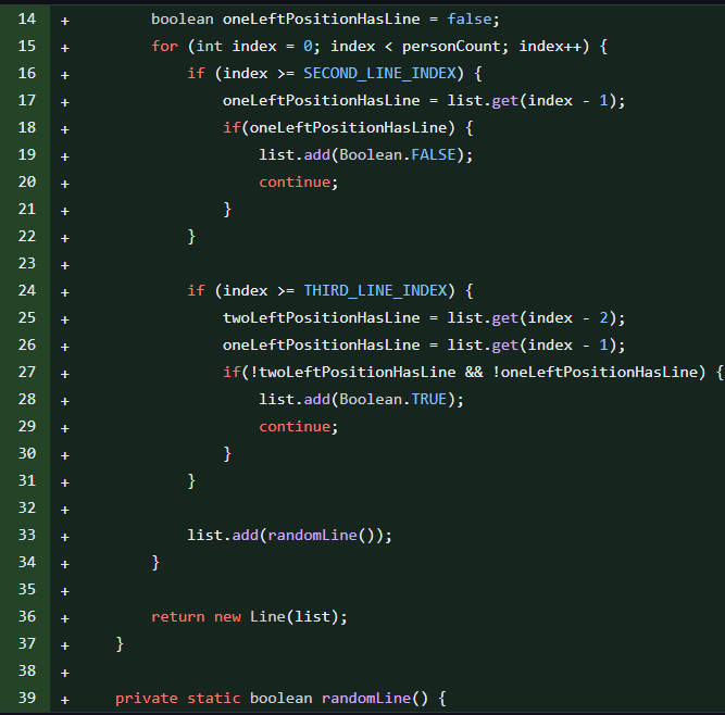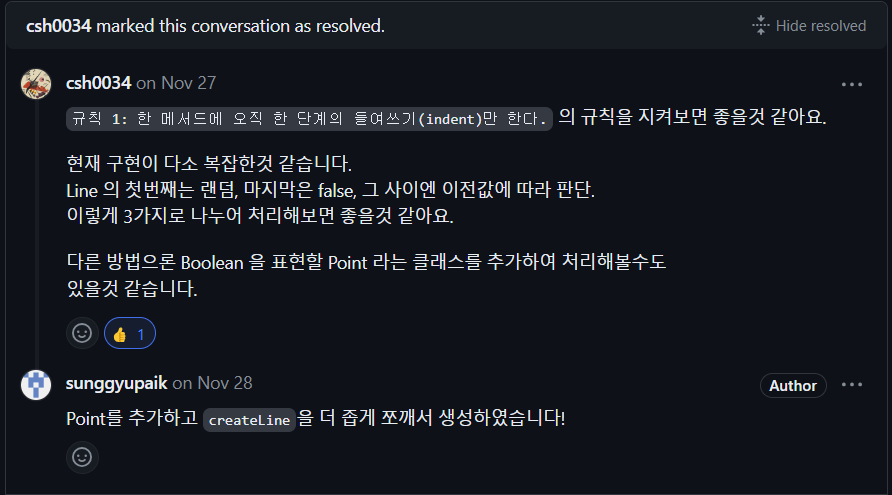 결과 값을 다시 매개변수로 활용하여 여러 번의 Line을 이동하도록 구현합니다. 현재는 list에서 값을 꺼내 일일이 비교하고 있습니다. getter로 비교하는 방식은 자제합니다. 재귀 형식을 사용하면 훨씬 편하게 줄일 수 있습니다. 첫번재와 마지막은 if문에서 검사하더라도 중간 값들은 재귀로 처리 가능하며 가독성이 올라갑니다.