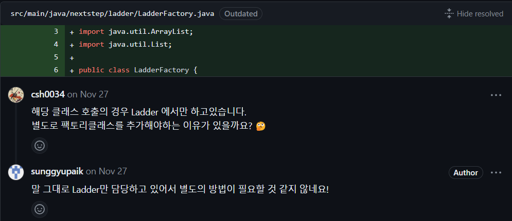 사다리를 생성하는 LadderFactory는 Ladder에서만 사용합니다. 이전에 로또번호를 생성하는 과제에서는 별도로 Factory를 분리했습니다. 제대로 로또 번호가 생성되었는지 테스트를 하기 위함이 큰데, 이번 리뷰에서는 오히려 만들지 않는 것이 낫다는 피드백을 받았습니다. 따로 정답이 있다고 생각하지 않습니다. 경우에 따라서 분리하거나 그냥 유지 할 수 있습니다.