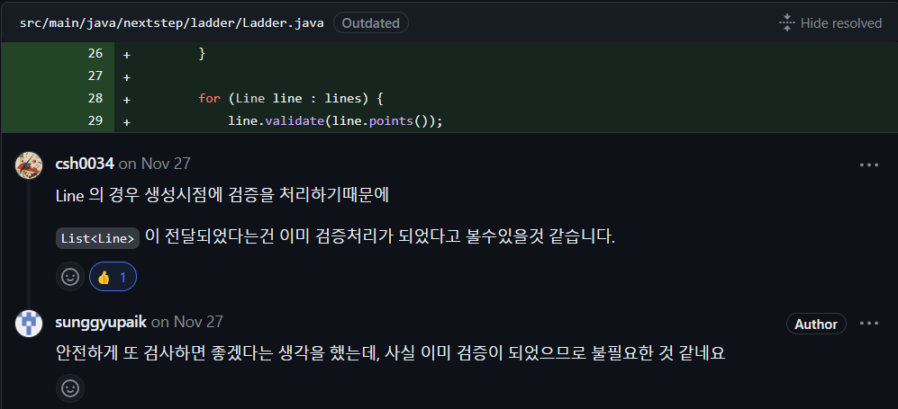Line 유효성 검증은 이미 Line 생성 시에 완료되었습니다. 따라서 별도의 유효성 검증을 하지 않아도 됩니다. 애초에 생성될 때 생성자에서 처리하도록 하며 테스트를 합니다.