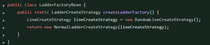 인터페이스 패키지와 실제 구현체 패키지가 서로 어느 것도 의존성을 가지지 않은 상태로 사용할 수 있도록 팩토리 빈을 활용합니다. 반환형은 확자성을 고려해 인터페이스로 하고 실제 구현한 구현체 클래스로 반환합니다. 한가지 주의 할 것은, 구현체 클래스 매개변수에는 인터페이스로 선언되어 있는데 구체 클래스를 넣어주는 것입니다. 만약에 다른 방식의 구현체가 있다면 인터페이스인 LadderCreateStrategy와 LineCreateStrategy는 유지하고 구현체만 교체하면 됩니다.