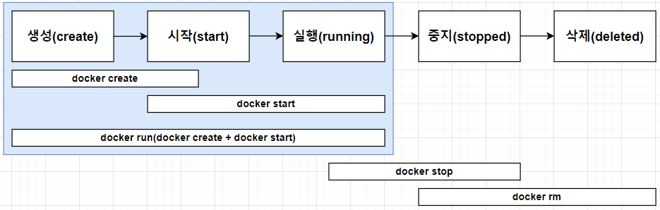 도커 컨테이너는 순서대로 생성, 시작, 실행, 중지, 삭제생명주기를 따르며 특히 자주 사용하는 docker run은 docker create와 docker start를 합친 명령어로 도커 컨테이너를 실행합니다.