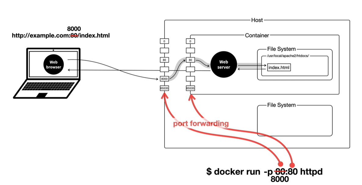 -p 8080:80: 8080은 접속하는 Host의 포트이며, 80은 Container의 포트이고 이 방법은 port forwarding입니다.