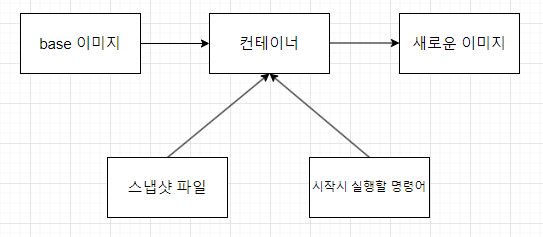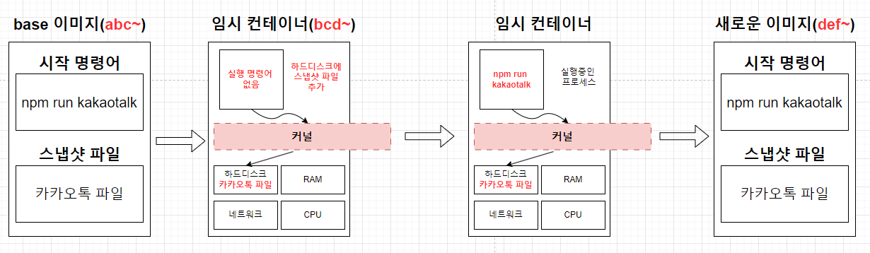 도커 이미지 생성 과정에서 중요한 점은 base 이미지를 기반으로 임시 컨테이너를 생성하고 최종적으로 새로운 이미지를 만드는 것입니다. 이 과정에서 id는 계속 변경됩니다. 임시 컨테이너에서 먼저 하드디스크에 스냅샷 파일을 추가하고 이후 시작시 실행 할 명령어가 추가됩니다.