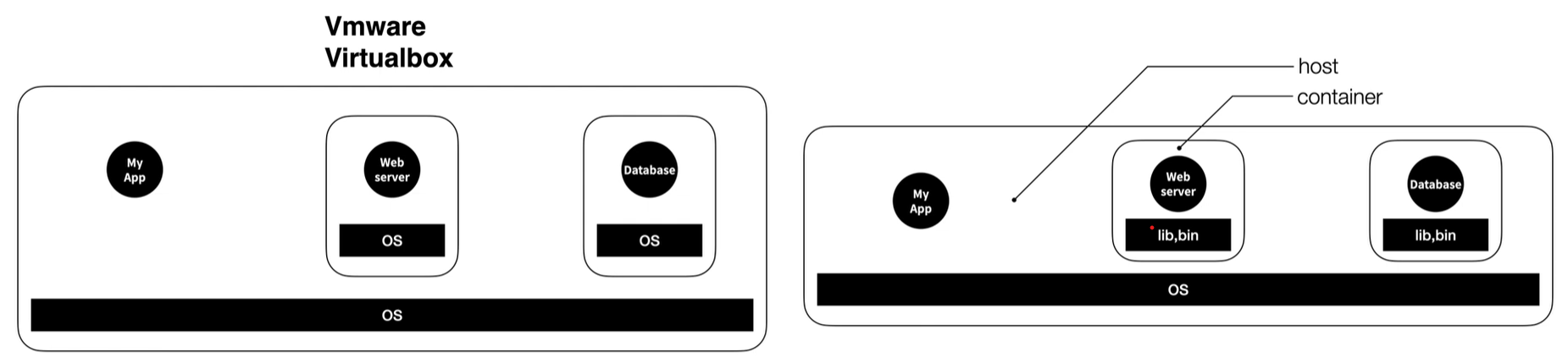 '1개의 OS'에 각 응용 프로그램의 실행에 필요한 라이브러리와 필수 파일들만으로 구성 및 격리된 도커 컨테이너 기술이 등장했습니다. 컨테이너 방식은 호스트 OS에 어플리케이션 실행 패키지만 배포하면 끝나지만, VM은 VM을 생성하고 게스트 OS를 부팅하고 어플리케이션을 실행해야 합니다. 따라서 도커 컨테이너는 하이퍼 바이저 기반 VM보다 훨씬 경량화된 구성으로 편리하게 응용 프로그램을 관리할 수 있도록 개선되었습니다.
