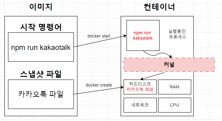 docker start: 시작 명령어 npm run kakaotalk을 입력하면 커널은 하드웨어 자원을 확인해 프로세스를 실행합니다. 커널은 프로세스와 하드웨어를 중간에서 관리합니다.