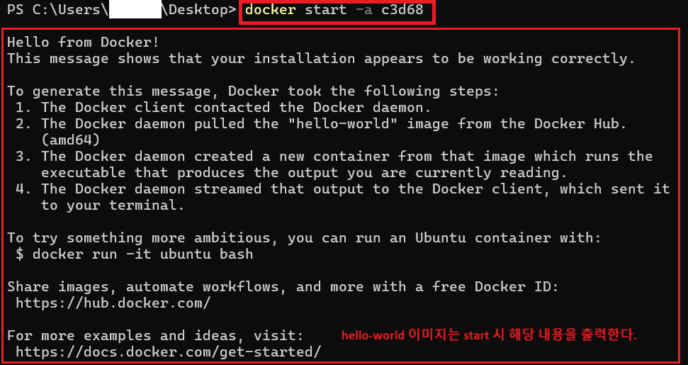 -a: 도커 컨테이너 시작 시 나오는 output을 출력한다.