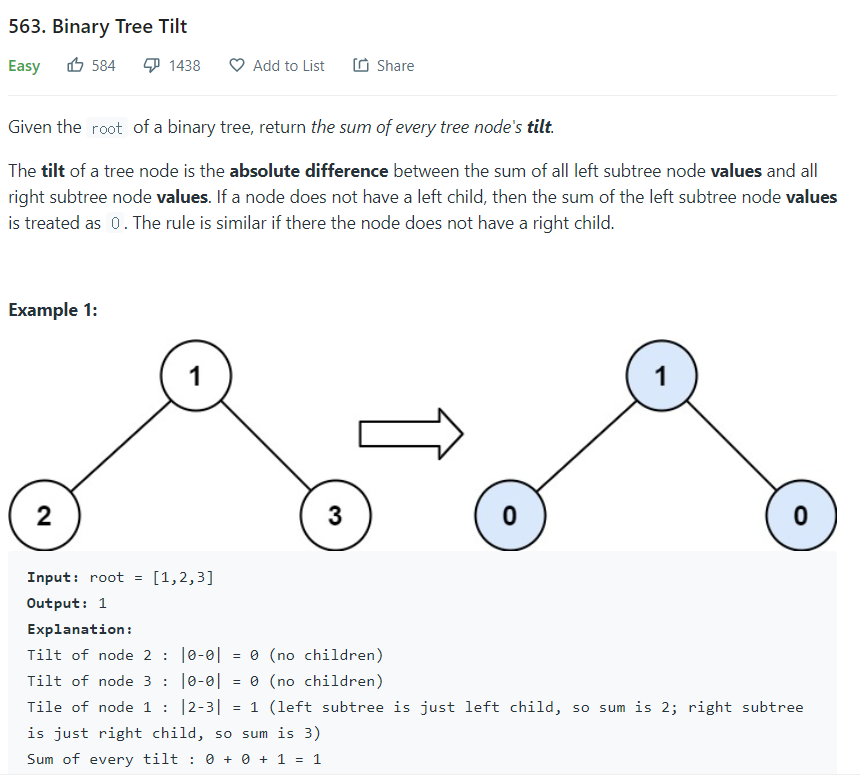 불쌍한 문제입니다. ㅜㅜ 비추수가 압도적으로 많습니다. 일반적인 tree의 문제가 아니라 그런 것 같습니다. 최근에 풀었던 파x 기업의 3번문제와 비슷합니다. postOrder 형식의 처리가 필요합니다. 즉, leaft쪽으로 먼저 이동해 root의 왼쪽 자식과 오른쪽 자식의 값을 계산하여 계속 부모쪽으로 올라오면서 최신화를 시켜주면 됩니다. 우리는 Tilt의 값을 찾으면 되기 때문에 굳이 TreeNode의 root값들을 최신화 시켜 줄 필요는 없습니다.