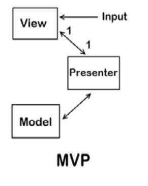 MVC와 달리 View에 Input이 들어와 Model에서 요청된 데이터를 처리하고 View로 결과를 반환한다. 즉, Model을 조작하며 View를 업데이트 한다. View와 Presenter는 완전히 결합이 분리되어 인터페이스로 소통한다. View를 분리하는 것이 쉽고 MVC보다 MVP가 어플리케이션의 유닛 테스트가 더 쉽다. Controller 대신에 Presenter를 사용한다. Presenter도 View와 같은 level에 위치하며 View와 Model 양 쪽 모든 이벤트들을 listen하며 2개 사이의 행동을 중재한다. (View를 ViewModel에 바인딩하는 개념인 MMVM과 다르다.) View와 Presenter는 1:1로 매핑하여 구현하한다. Presenter는 Model에서 수행하는 요청된 행동에 근거하여 View를 업데이트 한다. 그러나 View는 Model의 존재를 알지 못한다.